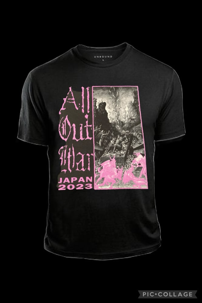 All Out War Japan 2023 tour shirt. One-sided purple and white ink on black T-shirt.